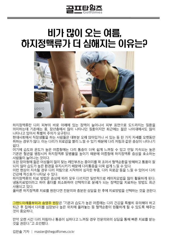 비가 많이 오는 여름, 하지정맥류가 더 심해지는 이유는? 페이지 정보 작성자 관리자 작성일16-08-22 16:21 조회16,300회 댓글0건 관련링크 http://www.thegolftimes.co.kr/news/articleView.html?idxno=25407 4199회 연결 이전글 다음글 목록 본문 . 댓글목록 등록된 댓글이 없습니다. 이전글 다음글 목록
